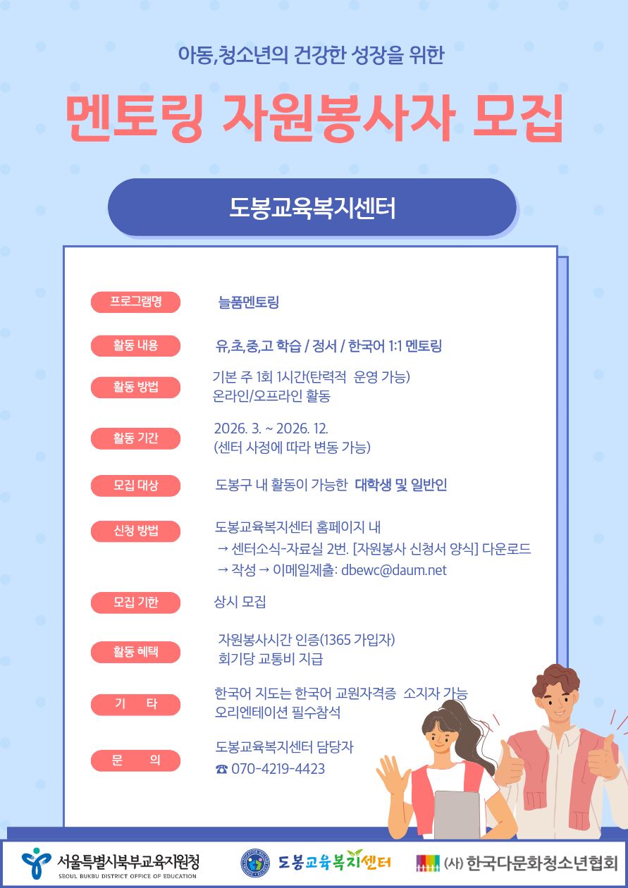 2026년 도봉교육복지센터 전문상담 자원활동가 모집 안내